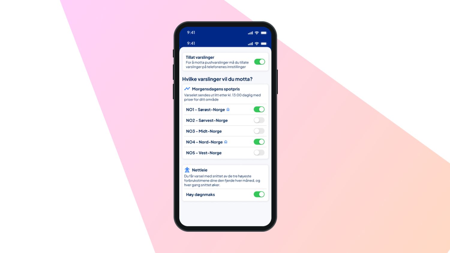 Hver dag litt etter kl. 13:30 får du et varsel med morgendagens spotpris – rett etter at prisene er satt på strømbørsen Nord Pool. Du kan selv velge hvilke prisområder du vil abonnere på, for eksempel hvis du har hus og hytte i ulike deler av landet.