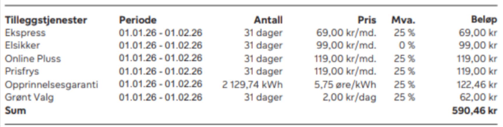 Skjermdump: Kunde har sendt inn bilde av tilleggstjenester på strømregningen sin