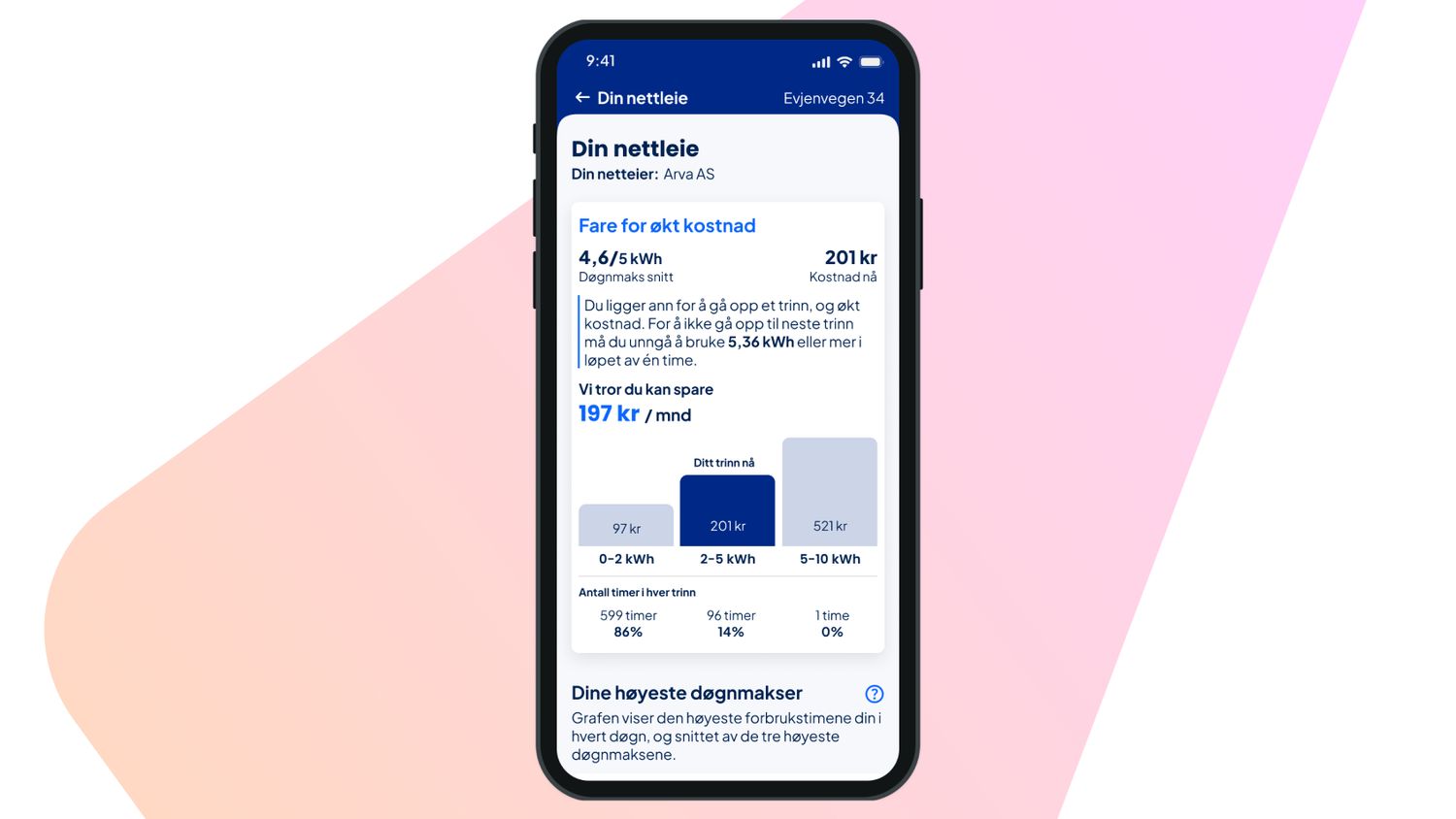For mange av våre kunder er det bare noen få timer i måneden som avgjør at de havner på et høyere nettleietrinn – og dermed må betale mer. I appen kan du enkelt holde øye med de såkalte døgnmaksene – timene der strømforbruket ditt er høyest. Der ser du raskt hvilke timer som trekker opp nettleien og hvor du kan spare mest.