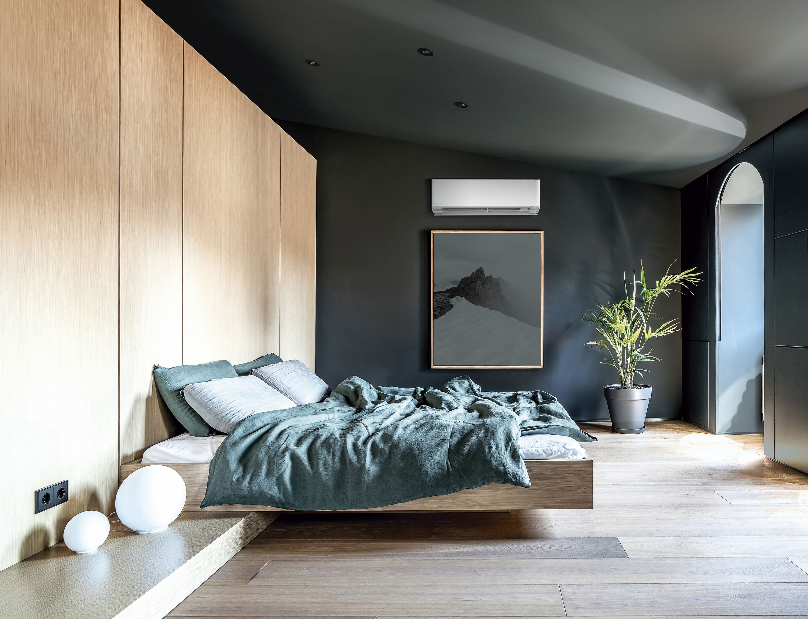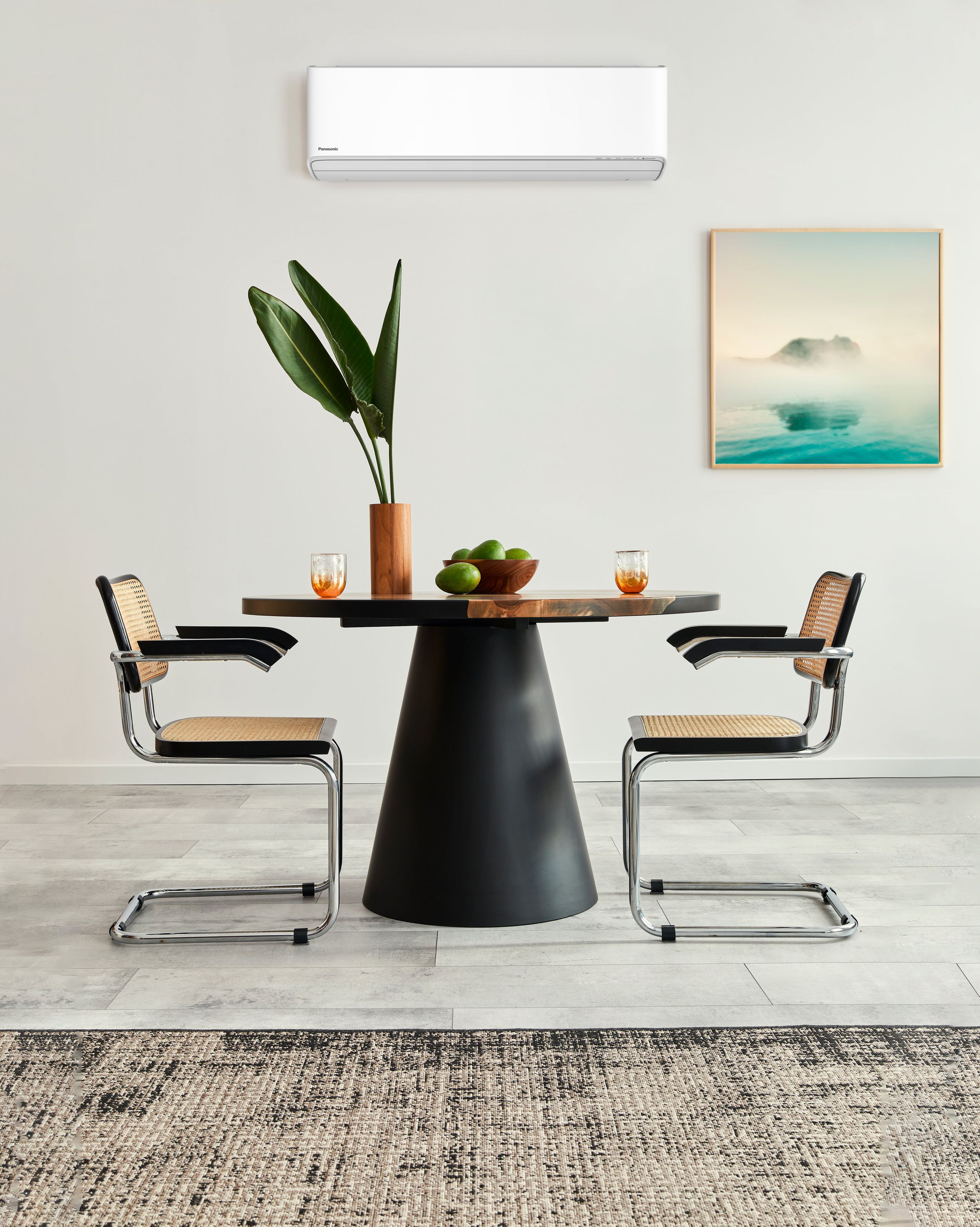 Toppmodellen til Panasonic - En stilig luft til luft varmepumpe i sort, egnet for selv de kaldeste vintrene
