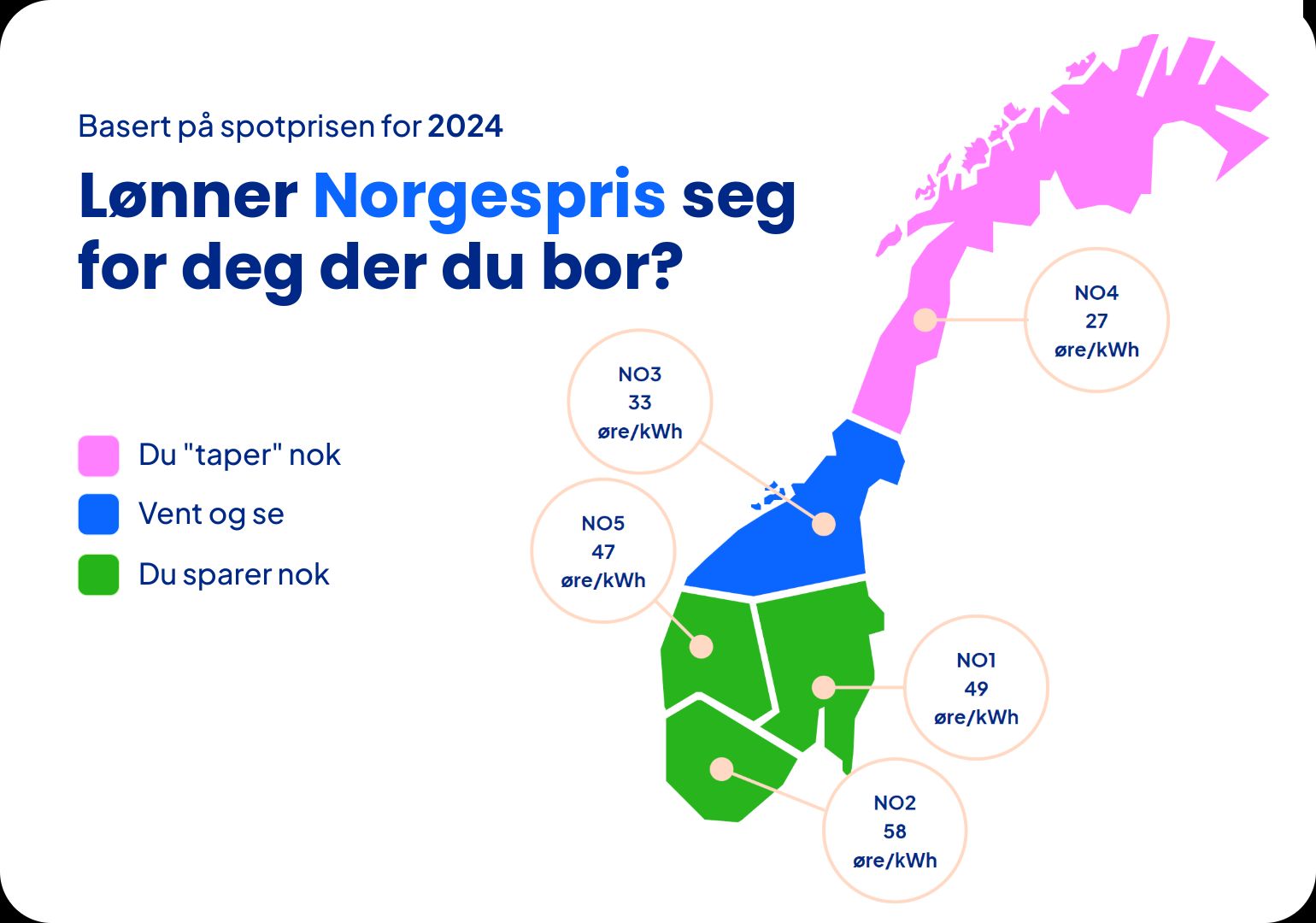 Videre ser det ut til at det ikke vil lønne seg med Norgespris om du bor i Nord-Norge, og foreløpig har Ishavskraft fastprisavtaler tilgjengelig som slår Norgesprisen. Bor du i Midt-Norge bør du ha is i magen og vente, det er ikke sikkert det lønner seg for deg med Norgespris. Følg med på spotprisen i til Ishavskraft eller .