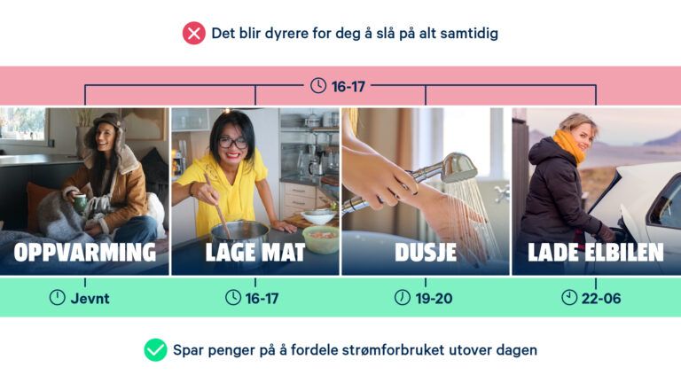 Det er oppvarming, varmtvann, induksjonstopp og elbil-lading som bruker mest strøm i hjemmet. Det betyr at hvis du skrur på panelovnene, lager middag og setter elbilen på lading samtidig vil dette gjøre at du får en unødvendig høy nettleie.