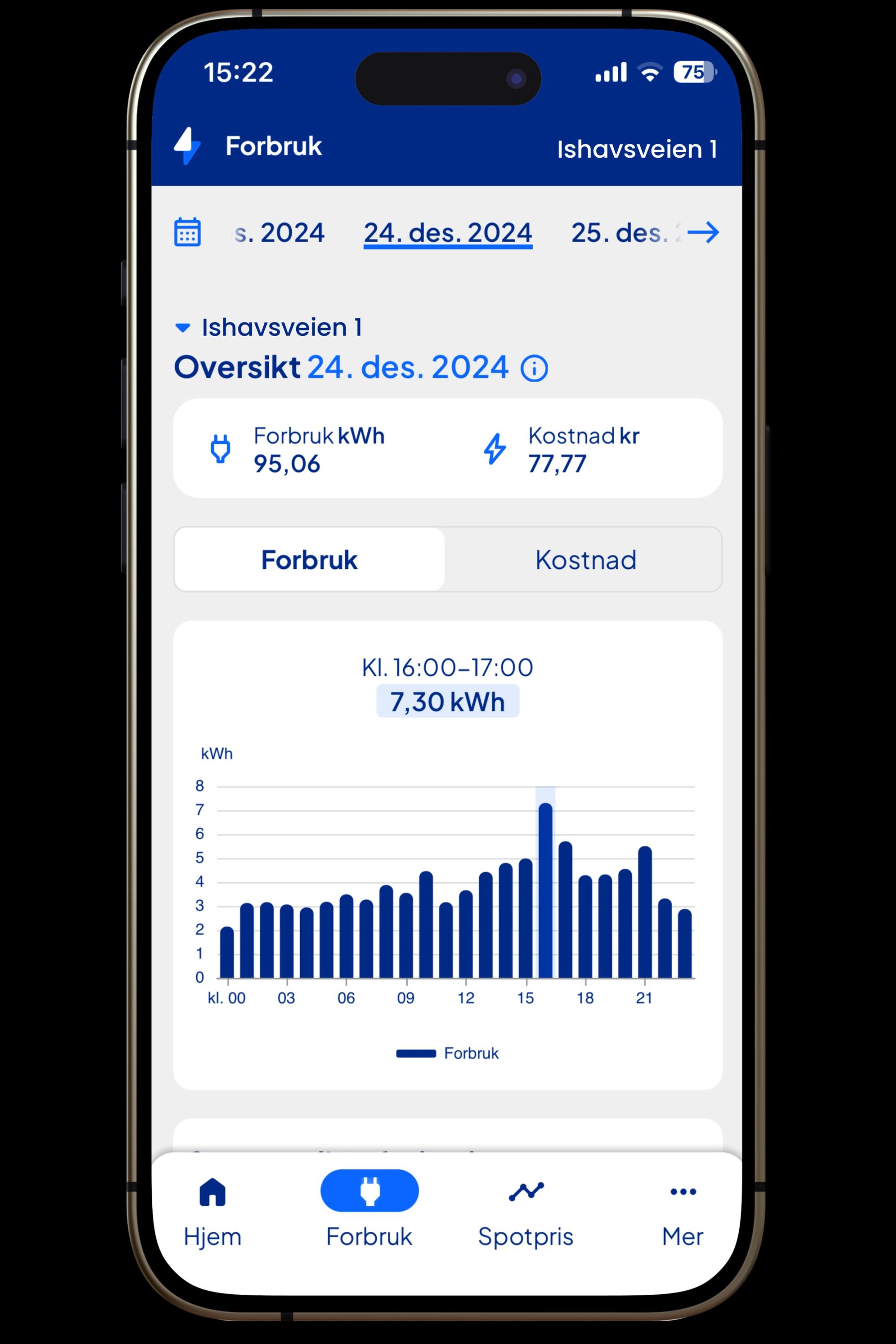 Bilde fra Ishavskraft-appen: Det er de timene mellom kl. 15 og 17 som ofte gir juleaftens høyeste strømforbruk.